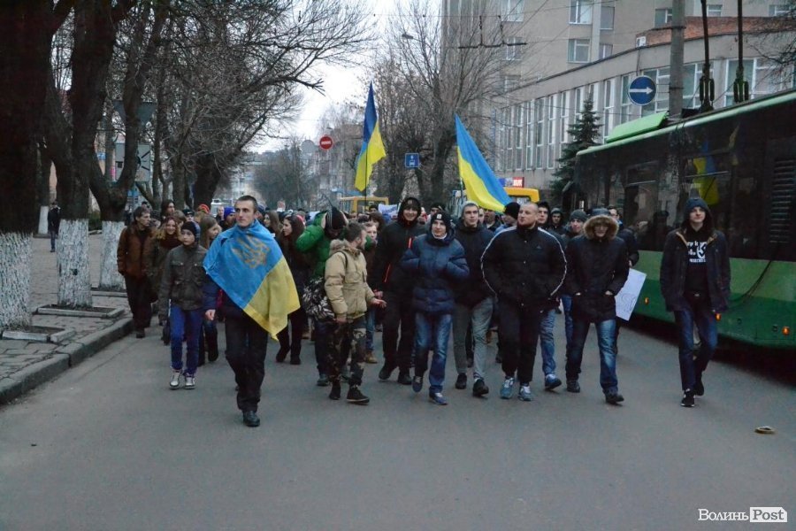 Як завжди більшість молодих людей випромінює щастя та радість несучи такі плакати..Молоді Луцька тільки пляски та танці минлих майданів в голові...Навіщо виходити на марш ,який покликаний вшанувати память загиблих, для веселощів???