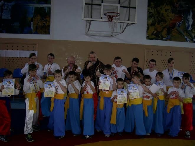 Команда МГО «Школи козацького гарту» та школи бойового гопака «Герць» з Верховним вчителем Володимиром Пилатом після змагань.