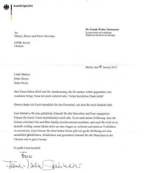 Його поважність – міністр закордонних справ Франк-Вальтер Штайнмаєр відповів на адресований йому лист.