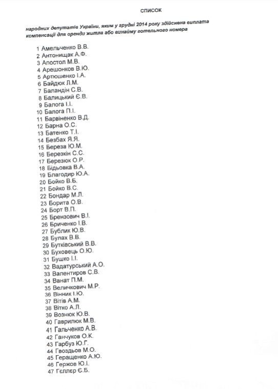 У газеті Верховної Ради «Голос України» оприлюднили список народних депутатів, які отримали компенсацію за оренду житла за грудень 2014 року.