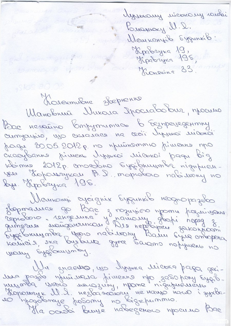 Лучани, які мешкають у будинках на Кравчука, 19, Кравчука, 19 б, та Конякіна, 33, звернулися до міського голови із проханням скасувати рішення міськради, яке надало дозвіл підприємцю продовжувати будівництво торгового павільйону.