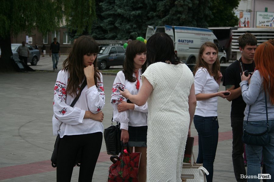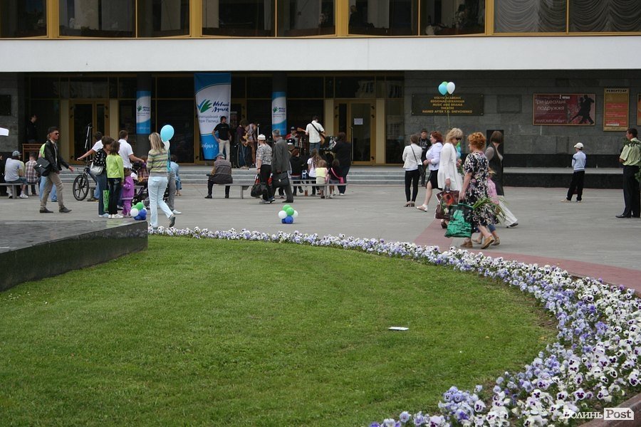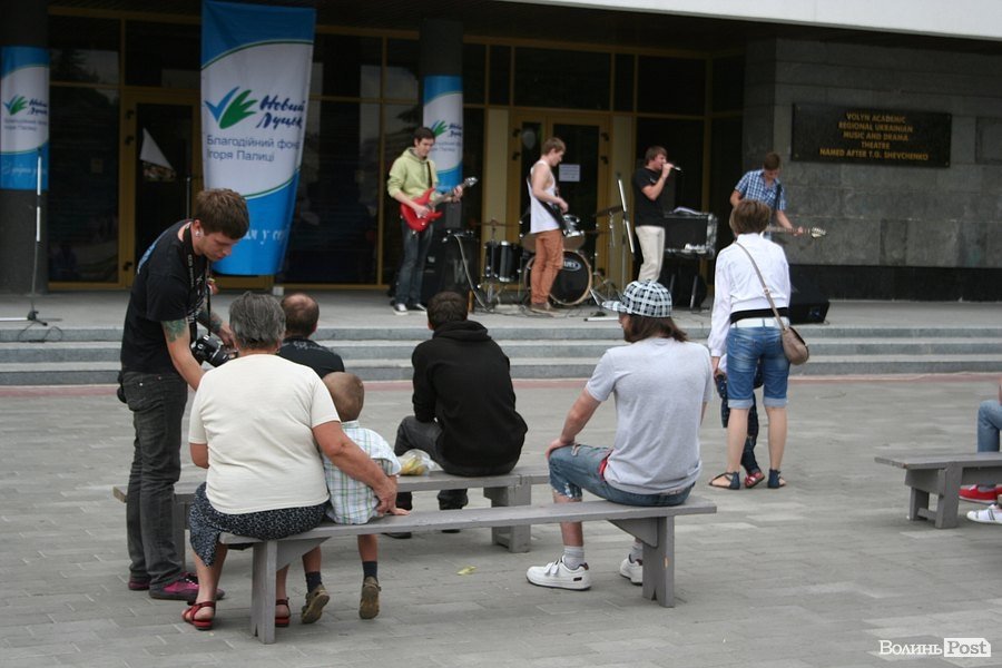 Біля входу в драмтеатр на імпровізованій сцені відбувся невеликий концерт рок-школи «Гараж», де спільно виступали діти зі своїми викладачами.