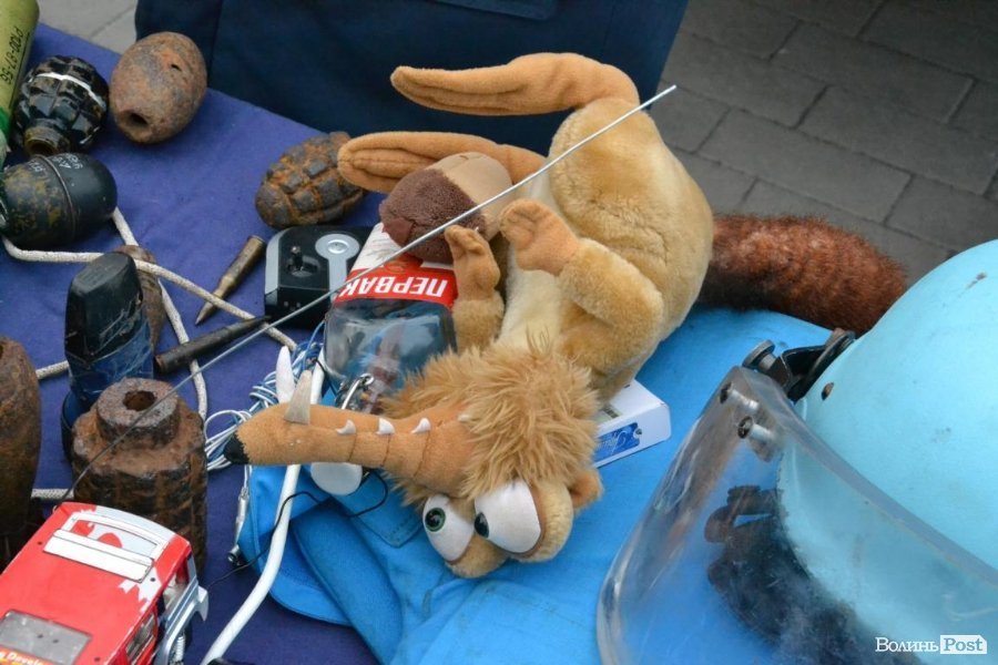 Також експерти-«надзвичайники» підготували виставку макетів боєприпасів та предметів, у яких ховають вибухівку. Саме такі небезпечні речі можуть загрожувати людям, які перебувають у зоні АТО. Подібні вибухові «сюрпризи» можуть маскувати під іграшки, шоломи, пляшки тощо.