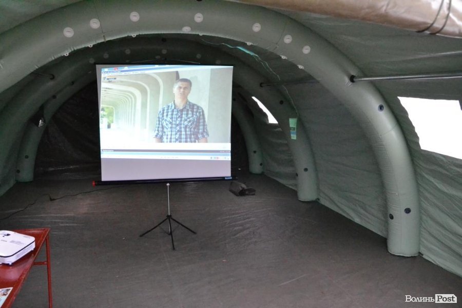 На Театральному майдані Луцька розгорнули спеціальний намет. У ньому охочі мають можливість переглянути фільми про основні правила поведінки під час надзвичайних ситуацій. Поряд лучанам дають довідники на цю тему.