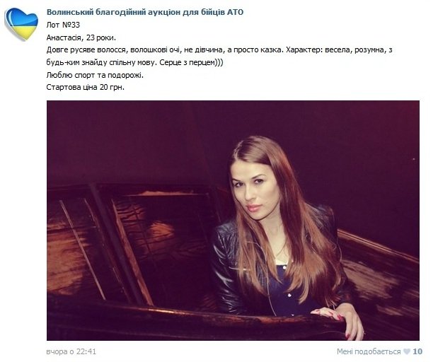 «Декілька років тому київські волонтери таким способом збирали гроші на лікування однієї дівчини, яка на даний момент часу жива і здорова. Дану акцію в той час афішували ЗМІ, завдяки чому я й дізналась про неї, і я вирішила, що можна було б організувати такий аукціон для збору коштів нашим солдатам в цей непростий час. І я запропонувала свою ідею Ірі Касабуцькій, волонтеру зі стажем, і вона мене підтримала. А потім ми спільно долучили до нашого проекту волонтера Юлю Гордон та одного із лідерів волинських ультрас Тараса Третяка», - каже дівчина.