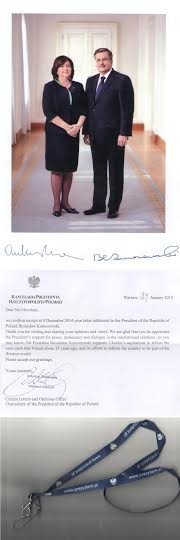 Президент сусідньої європейської держави – Польщі Броніслав Коморовський (Bronisław Komorowski) та Перша леді Польщі Анна Комаровська (Anna Komorowska) не стали осторонь впливових політичних, громадських та релігійних діячів світу і також надіслали поважний лист «юним дипломатам» із Волині, а саме: Марійці, Борису та Павлу Мовчанам, - повідомили у прес-центрі "Дитячої мрії".