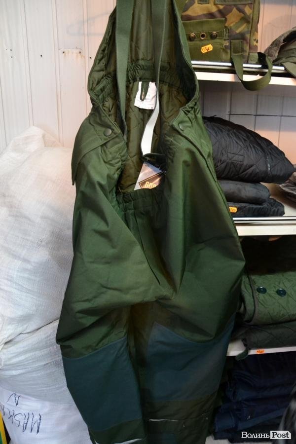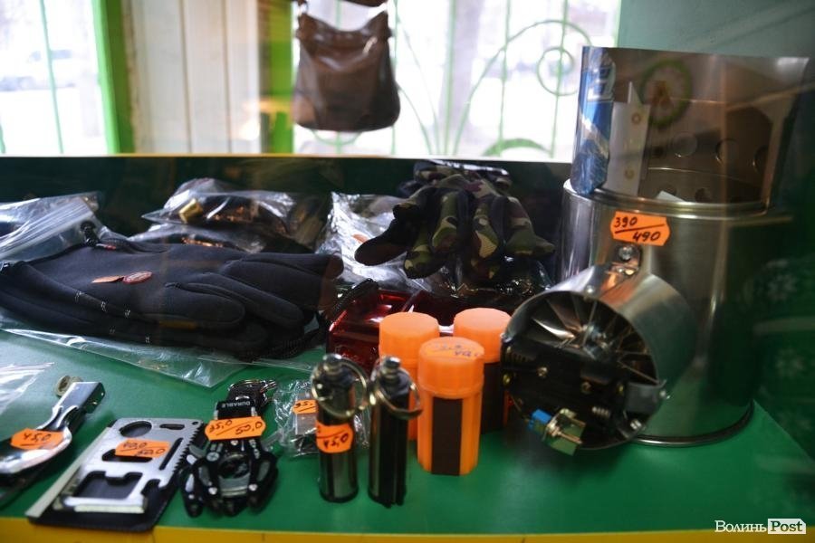 Тут продають парки, берці, комбінезони, бушлати, термобілизну, спальники, тактичні ножі, батарейки, наколінники, ножі - усе, що може стати при нагоді на передовій.