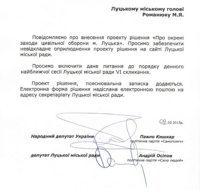 Народний депутат України Павло Кишкар ("Самопоміч") та депутат Луцької міської ради Андрій Осіпов ("Сила людей") внесли на розгляд чергової сесії Луцькради проект про заходи цивільної оборони мешканців міста Луцька.