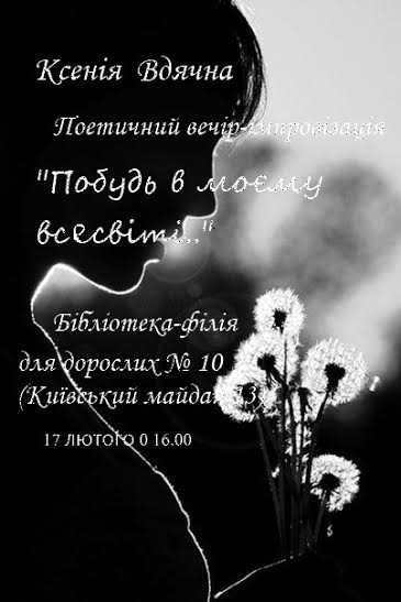 Молода волинська авторка Оксана Ганущак (псевдонім Ксенія Вдячна) познайомить усіх, хто любить поезію, із своєю творчістю. Всі, хто матиме бажання, зможуть зачитувати поезію авторки під музику.