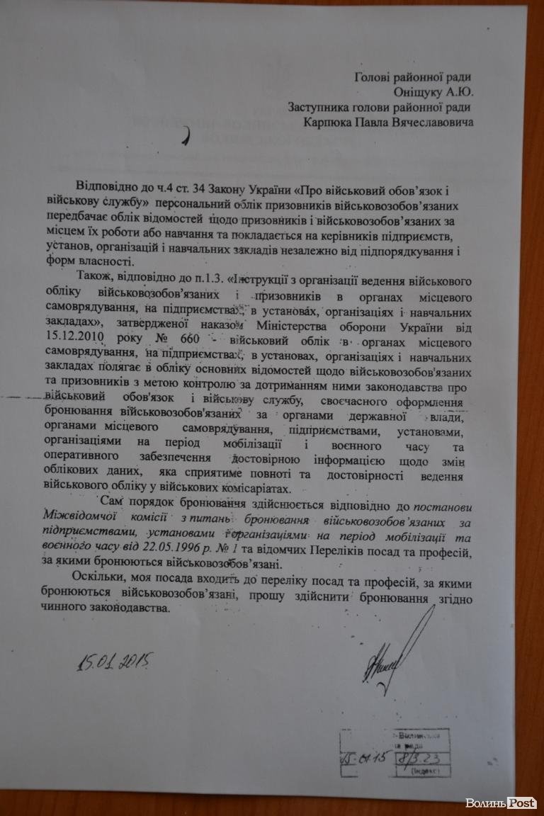 Щоб виправдати своє намагання «забронюватися», Павло Карпюк 15 січня надав пояснення Андрій Онущуку. У ньому йдеться «оскільки моя посада входить до переліку посад та професій, за якими бронюються військовозобов’язані, прошу здійснити бронювання згідного чинного законодавства».