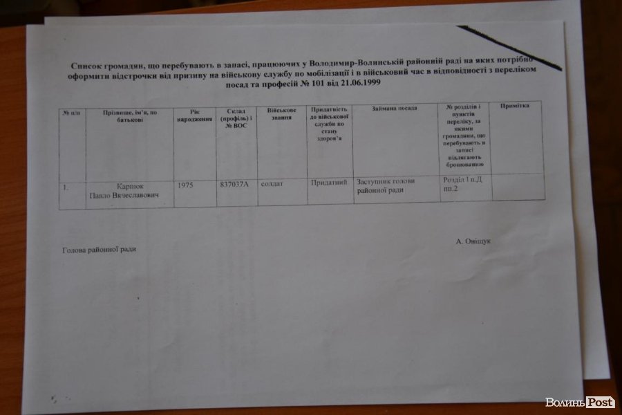 Заступник голови Володимир-Волинської районної ради Павло Карпюк намагався пролобіювати рішення про бронювання його від мобілізації, однак таки отримав повістку.
