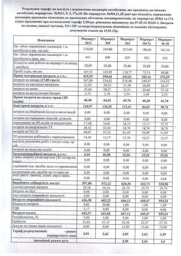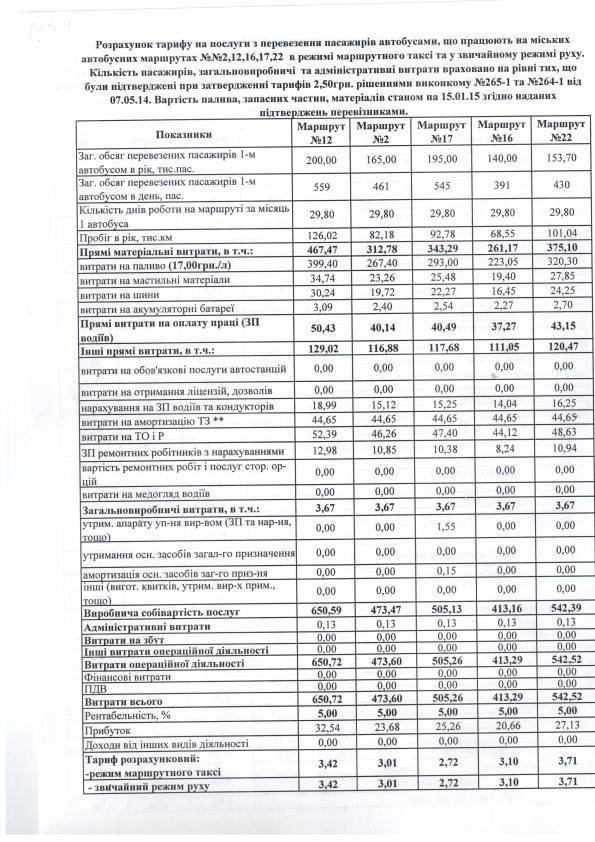 У документі йдеться, що в тариф – 2,5 гривні закладали вартість палива – 17 гривень за літр, натомість наразі вона більша за 20 гривень, а витрати на паливо у собівартості – 55%. Ціни на шини із квітня 2014-го року зросли із 1650 до 3200 гривень, вартість акумуляторів – із 940 до 1800 гривень, а вартість технічного обслуговування автобусів зросла на 50%.