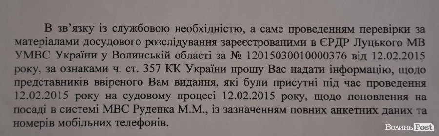 У документі ВолиньPost просять надати повні анкетні дані та телефони журналістів, які були на судовому засіданні 12 лютого.
