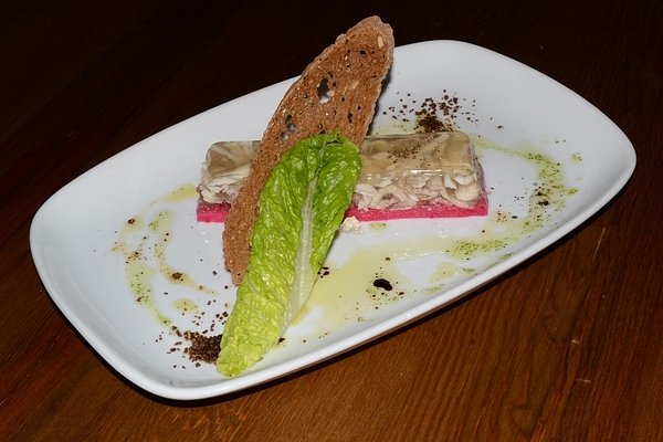 Любителям м’ясних страв до смаку припаде ароматний холодець з молодого півня на подушці з молекулярного хрону чи пікантне карпачо з сала під шоколадом, горіхом та чорносливом.