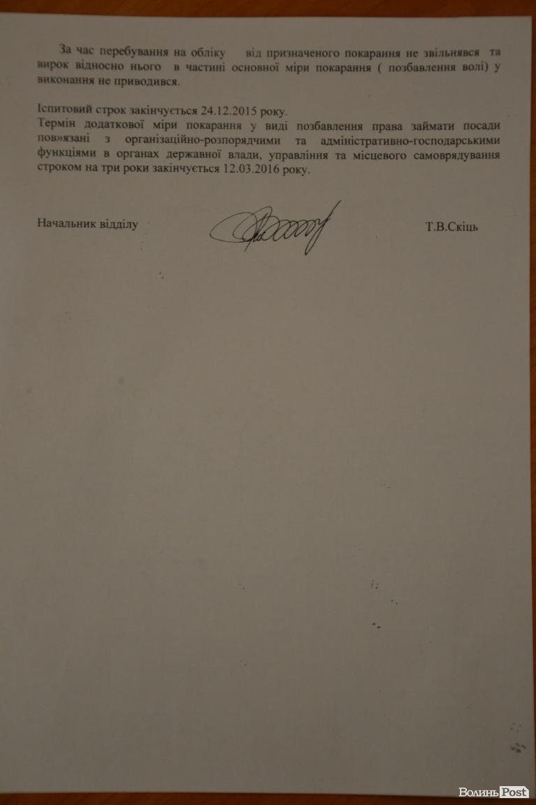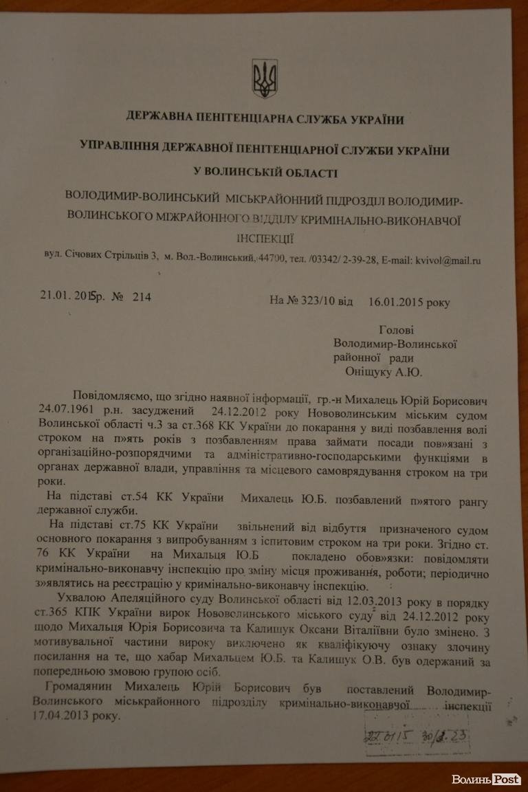 Про це йдеться у відповіді Володимир-Волинського міськрайонного підрозділу Володимир-Волинського міжрайонного відділу кримінально-виконавчої інспекції УДПСУ у Волинській області на запит голови райради Андрій Оніщука від 21 січня 2015 року.