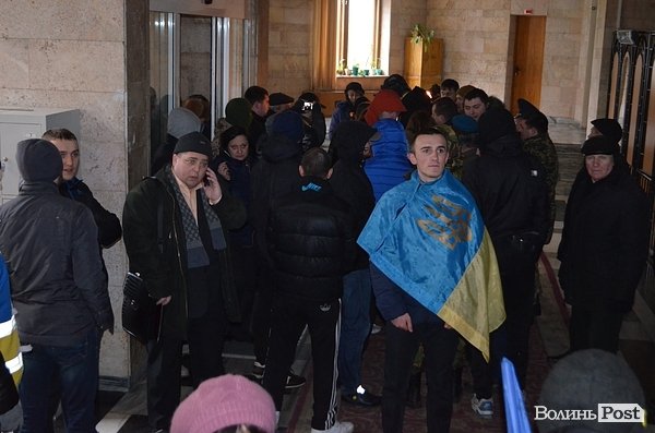 Коли активісти намагались потрапити у будівлю, у холі на них чекали люди, одягнені в жилетки з написом «Автомайдан Волині». Невідомо, хто кому перешкоджав зайти до будівлі і хто розпочав штовханину.