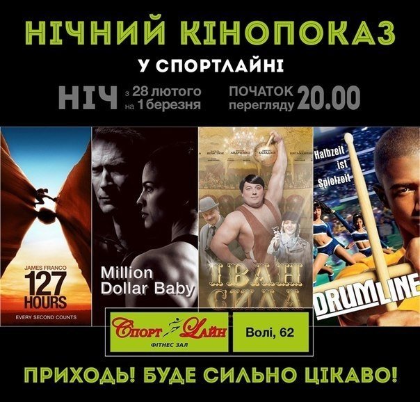 Кінопоказ відбудеться 28 лютого о 20:00 за адресою проспект Волі, 62 (фітнес-зал «Спорт-Лайн»). Вхід на захід вільний.