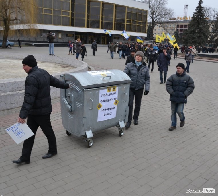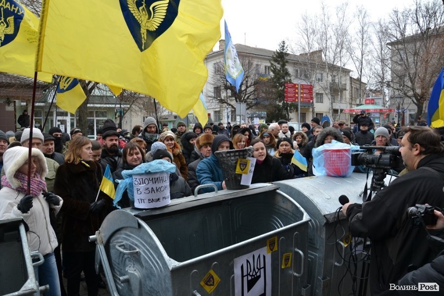 Розпочали День гніву із мітингу біля стін прокуратури Волинської обласної. До вхідних дверей активісти підвезли сміттєві баки, обклеєні різними гаслами, та поклали біля них сокиру.