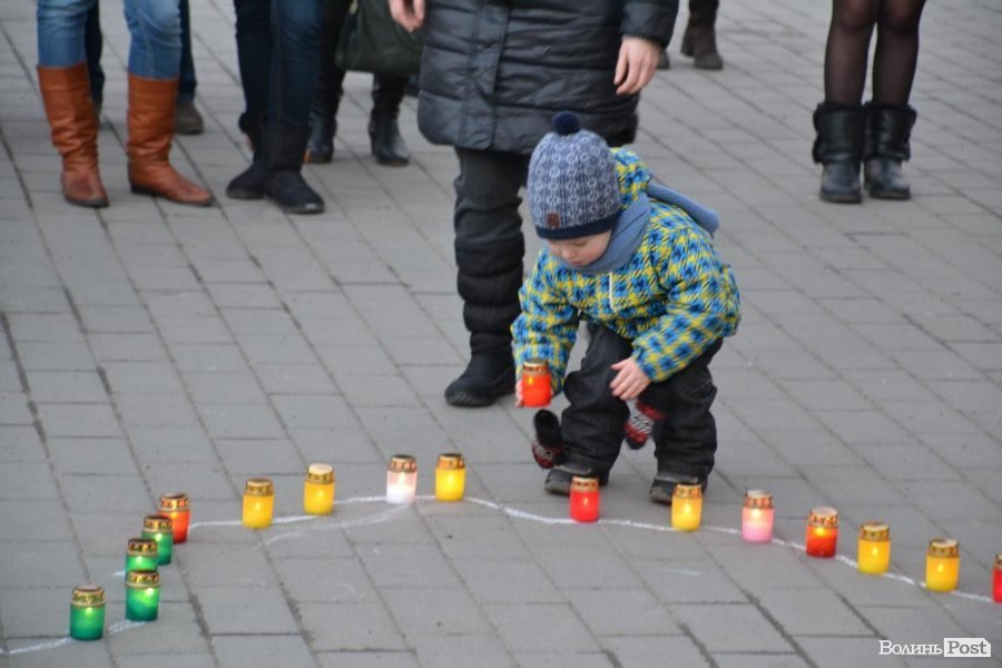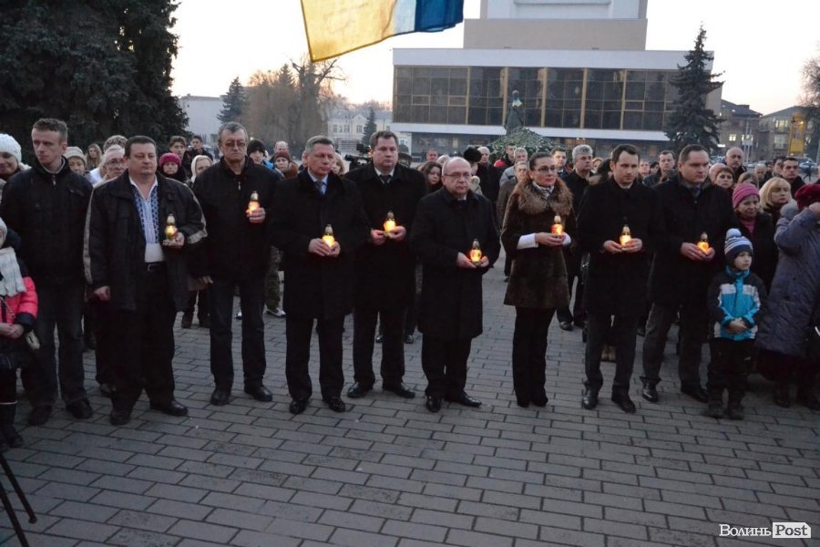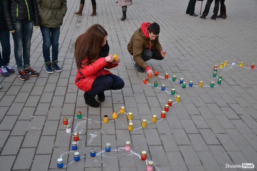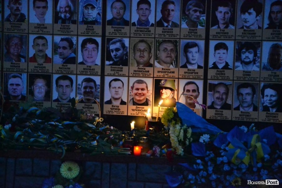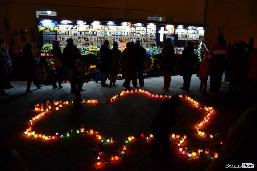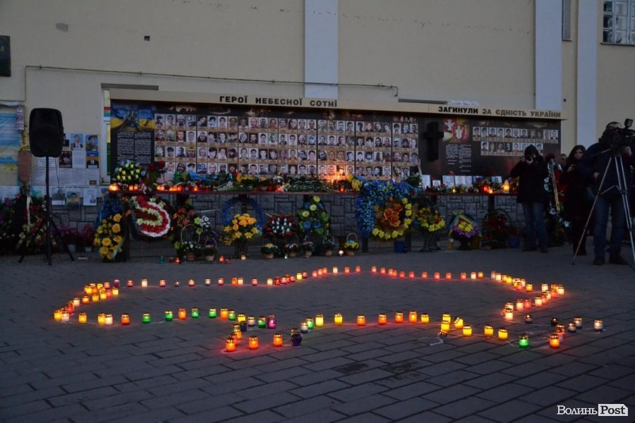 У центрі Луцька біля фотостенду, присвяченого Небесній Сотні, лучани зібралися, щоб вшанувати пам'ять загиблих на Майдані під час Революції гідності.