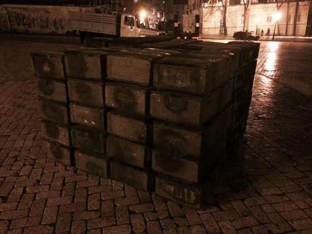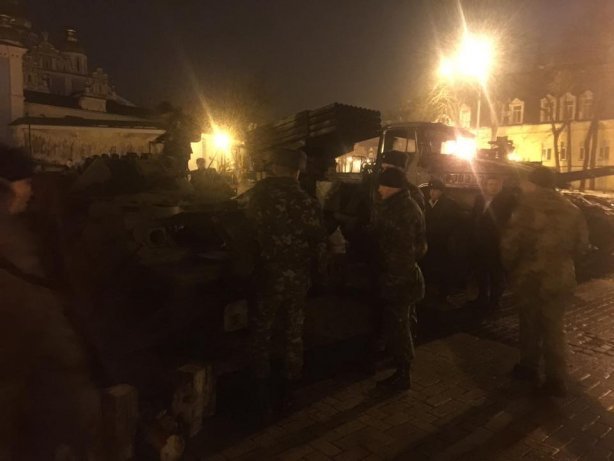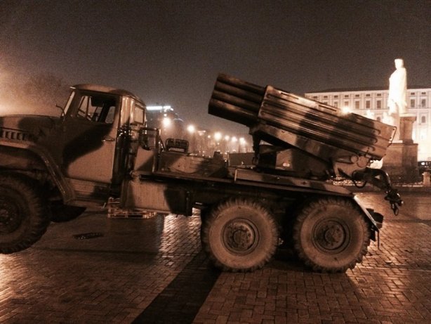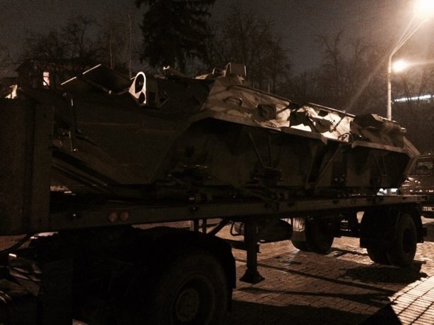 Російські танки, "Гради", БМП, БТР та іншу військову техніку, яку бійці АТО взяли в "полон", звозили на площу всю ніч.