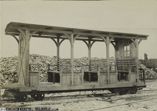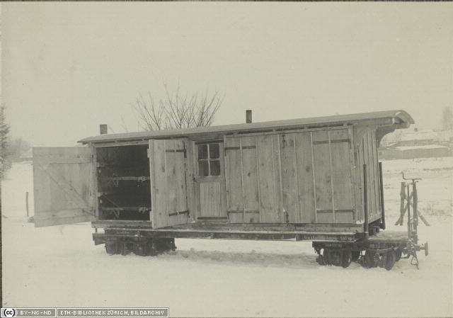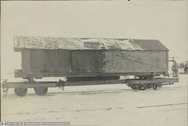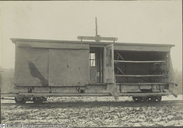 На чотирьох світлинах, які датуються 1916 роком, показані вагони для транспортування військових. Їх також використовували як мобільні медичні пункти для перевезення поранених. На знімки потрапив відтинок фельдбану Іваничі-Рачин.