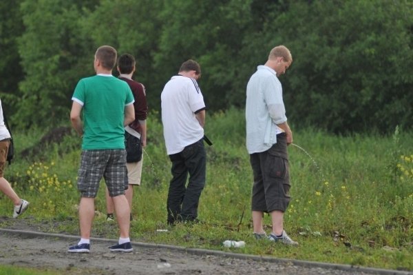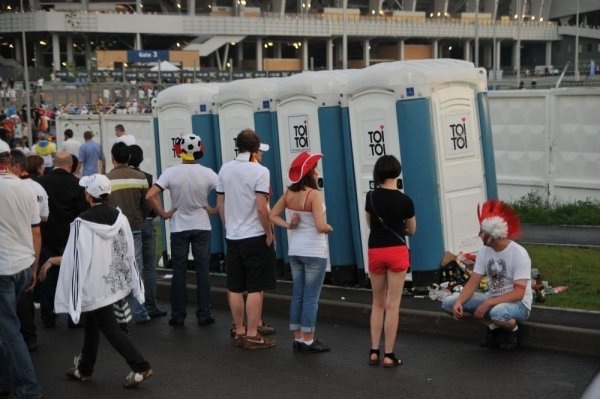 Виходячи із автобуса фани одразу бігли на обочину щоб справити свою нужду. Кілька туалетів були розташовані лише біля самого стадіону. До них стояли великі черги.