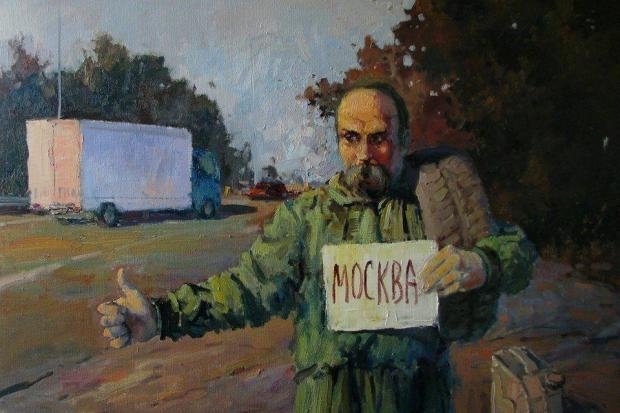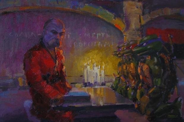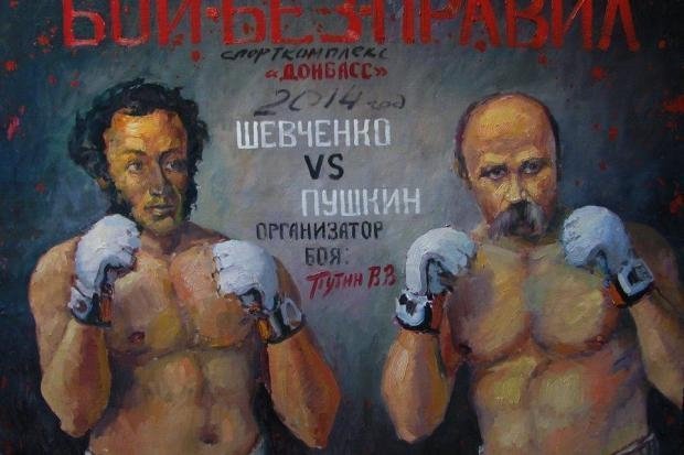 Картини, на яких Тарас Шевченко на вулиці Грушевського із шиною в руках, на передовій з автоматом та інші увійшли до серії “Григорович”, виконаної у стилі модерн.