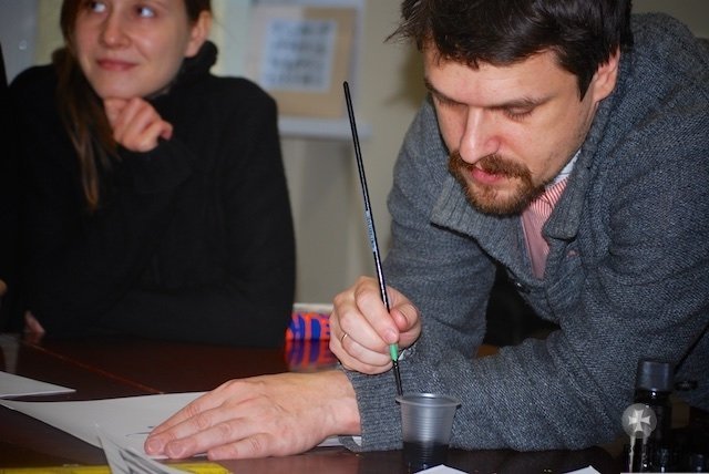 Ведучим майстер-класу став дизайнер-графік, ілюстратор, шрифтовик Кирило Ткачев, якому вдалося із дружиною-художницею втекти із окупованого Луганська. На майстер-клас прийшло із десяток лучан, переважно - художників.