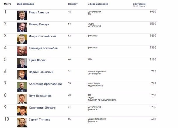 Найбагатшим українцем залишається Ринат Ахметов. Стан олігарха оцінюється в 6,9 мільярда доларів. На другому місці - медіамагнат Віктор Пінчук (1,5 мільярда доларів), на третьому - засновник фінансової групи Приват Ігор Коломойський (1,4 мільярда доларів).