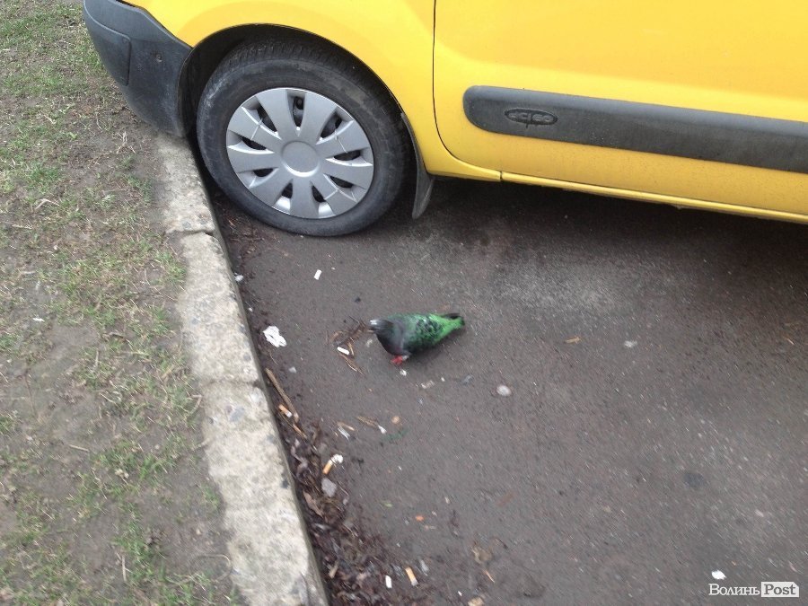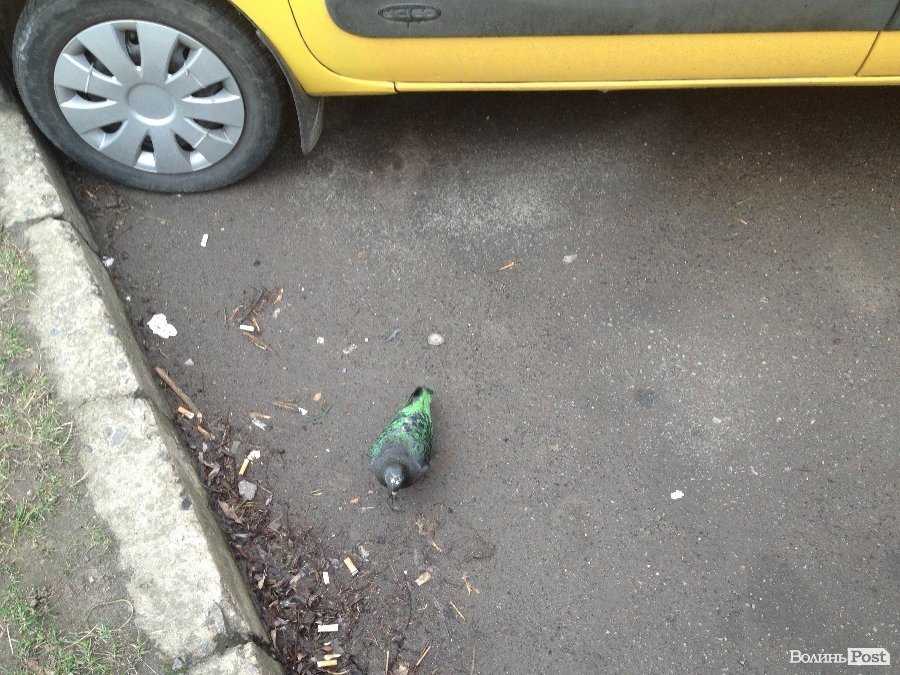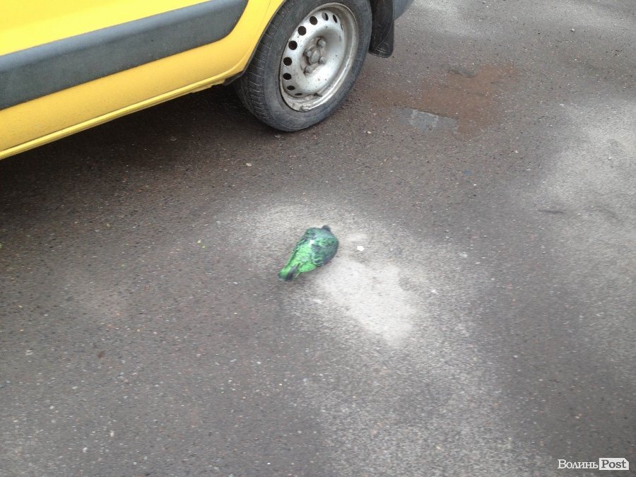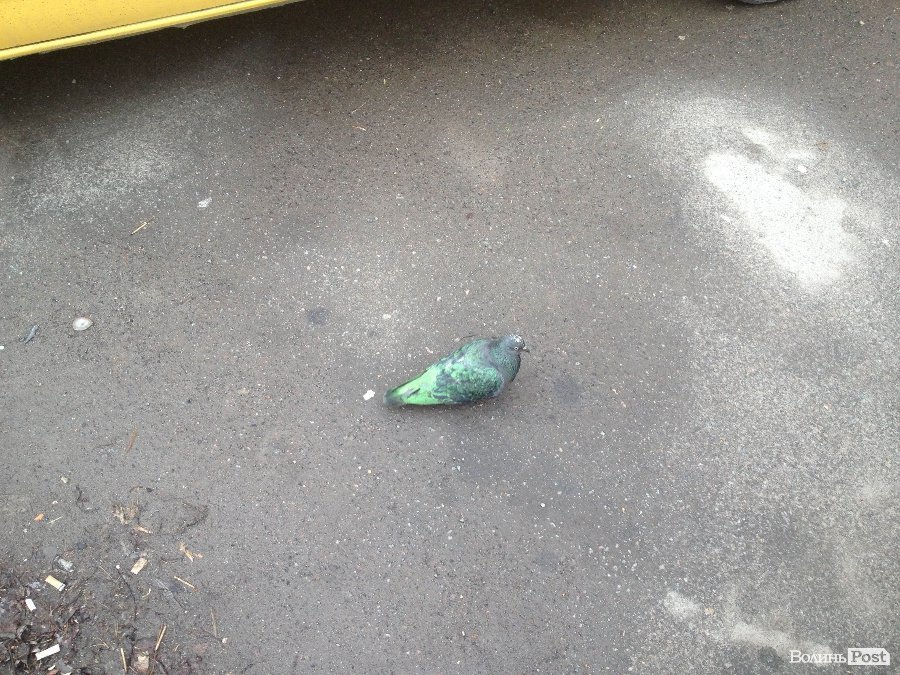 Птаха - зеленого кольору. Голуб на вигляд - здоровий, ходив на вулиці Кравчука у пошуках їжі.