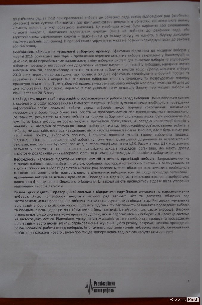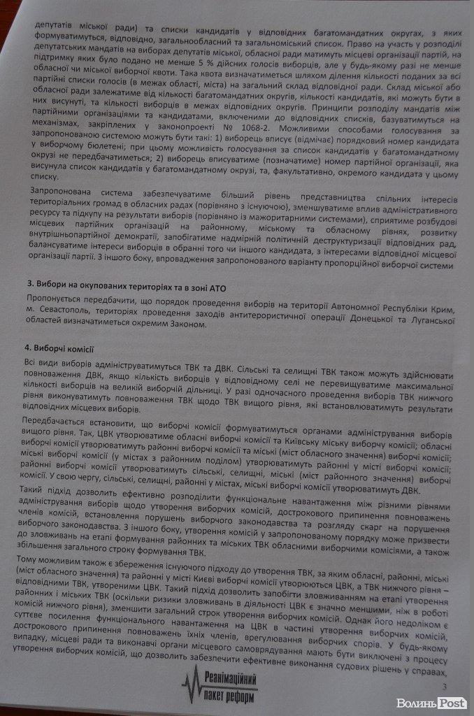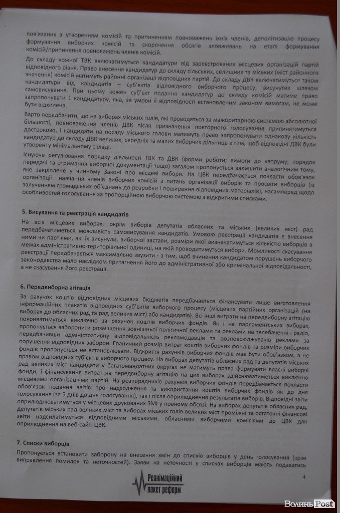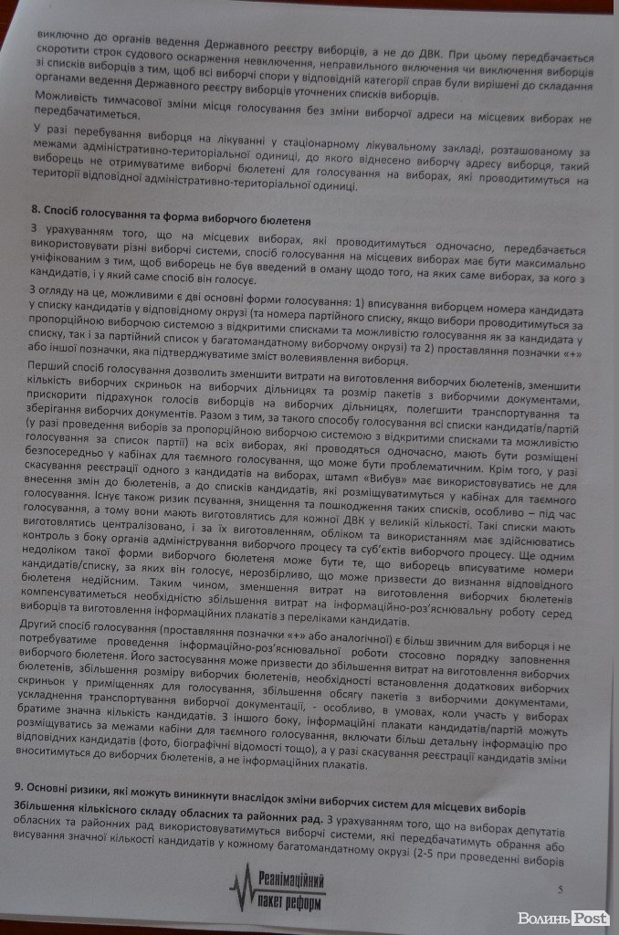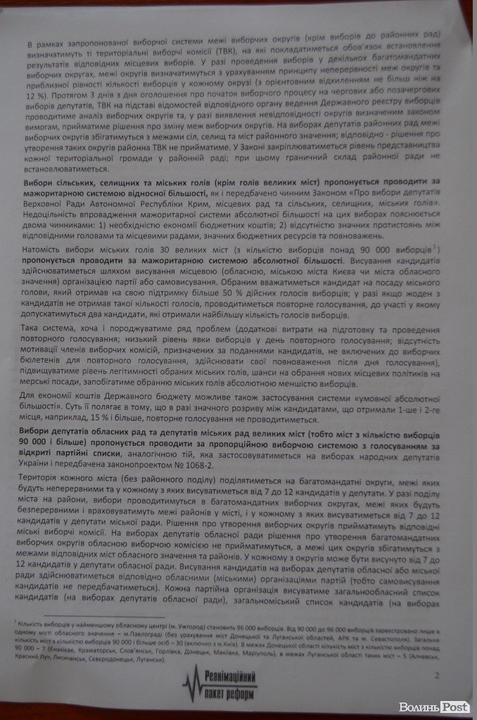 «Ми пропонуємо декілька виборчих системи. Перша - всі вибори, окрім виборів до обласних рад та рад великих міст, де кількість виборців - до 90 тисяч, проводити вибори за мажоритарною системою з багатомандатним округом. Друга – у великих містах, де є 90 тисяч виборців, там мери обиратимуться у два тури, альтернативою якому може бути великий розрив у голосах за кандидатів.