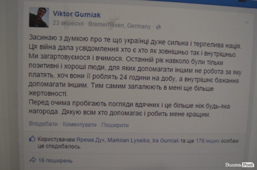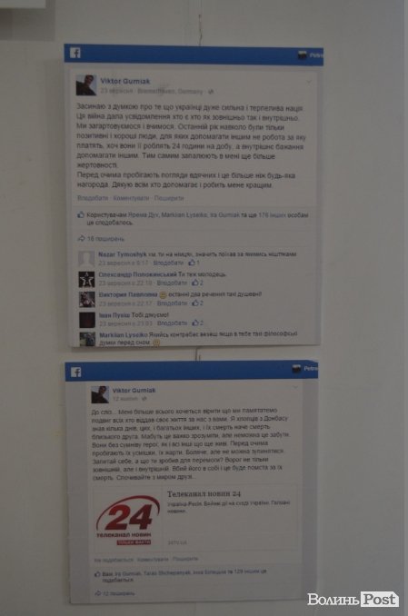 «Віктор служив у батальйоні «Айдар» і перебував на 31 та 32 блокпостах. Він часто розвозив поранених по госпіталях. І під час однієї із таких поїздок у нього потрапив осколок і він загинув у молодому віці залишивши дружину і маленьку доньку. Під час виставки ми збиратимемо кошти для маленької Юстинки Гурняк, кожен охочий може надіслати певну суму на банківський рахунок. Ці гроші донька Віктора може використовувати коли вона стане повнолітньою», - резюмував пластун.