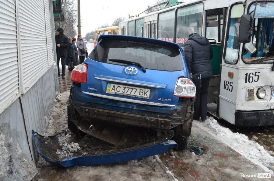 Головний ревізор із безпеки руху Луцького підприємства електротранспорту Валентина Задерей зазначила, що в тролейбусі повністю розбита права частина лобового скла і розбита передня фара. "Тойота" також дуже пошкоджена - ліва сторона зім'ята і розбита задня частина автомобіля.
