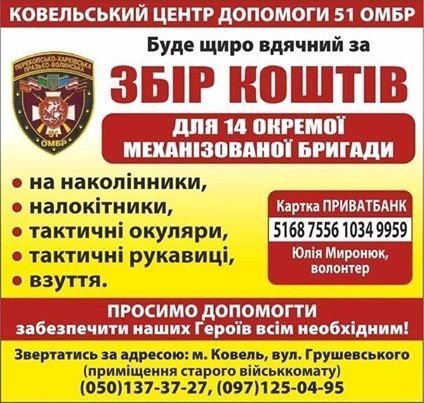 Ковельський центр допомоги 51 ОМБР проводить збір коштів військових, - повідомляють волонтери на своїй сторінці у Facebook.