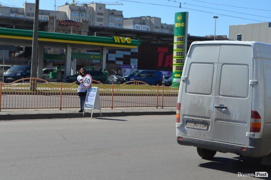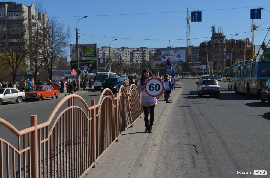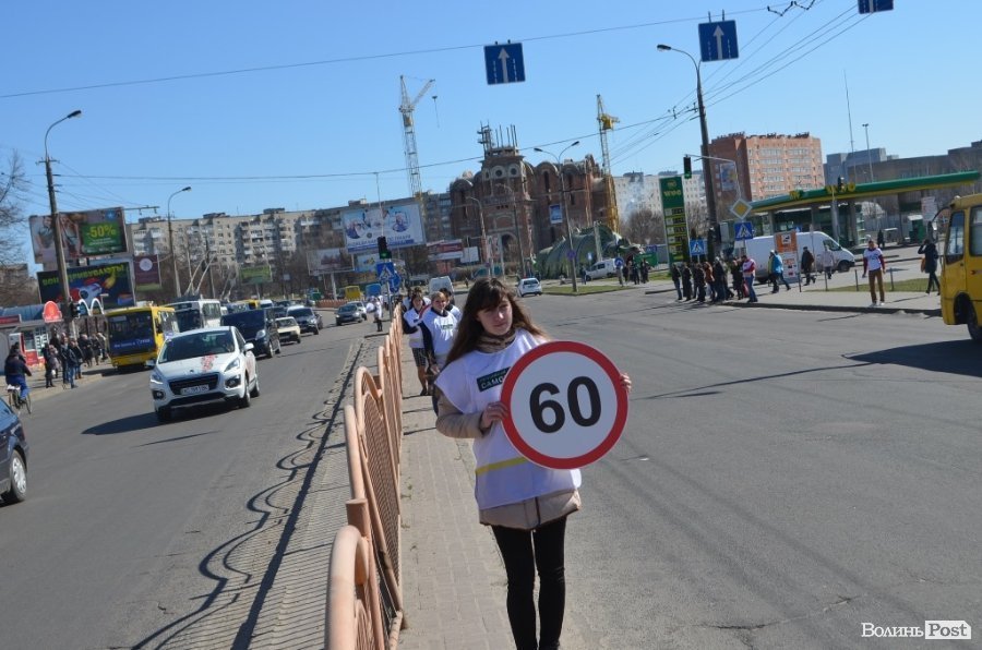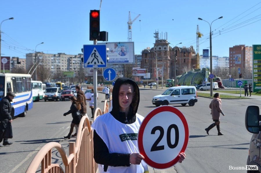 Під час акції волонтери тримали у руках знаки обмеження швидкості транспортних засобів, а також роздавали водіям інформативні листівки, коли ті стояли на світлофорі.