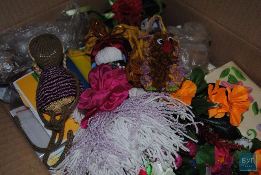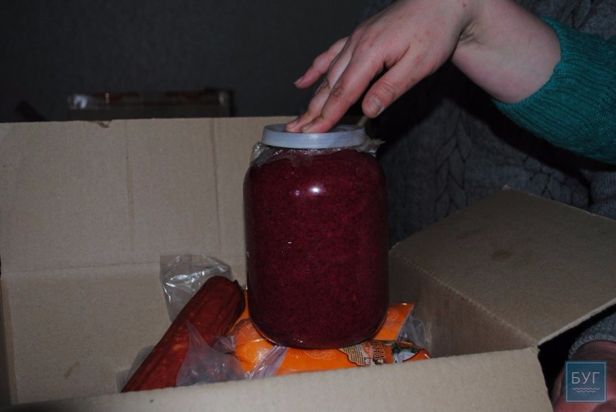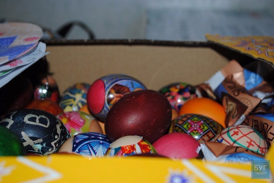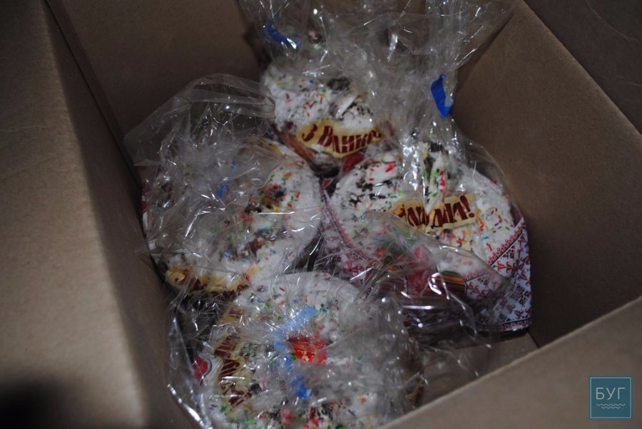 У пакунках домашні паски, ковбаси, крашанки, усілякі смаколики та сувеніри від учнів шкіл та гуртківців. А ще – велика банка запашного хрону. Присутні жартують, що без нього м’ясо не таке смачне.