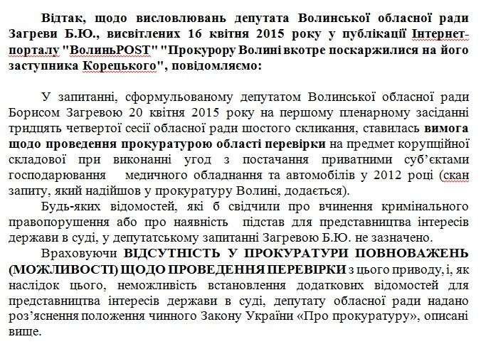 У прокуратурі Волинської області йому відповіли, що згідно з нововведенням до закону України "Про прокуратуру" скасували функції прокуратури щодо здійснення нагляду за додержанням і застосуванням законів (так званого загального нагляду).