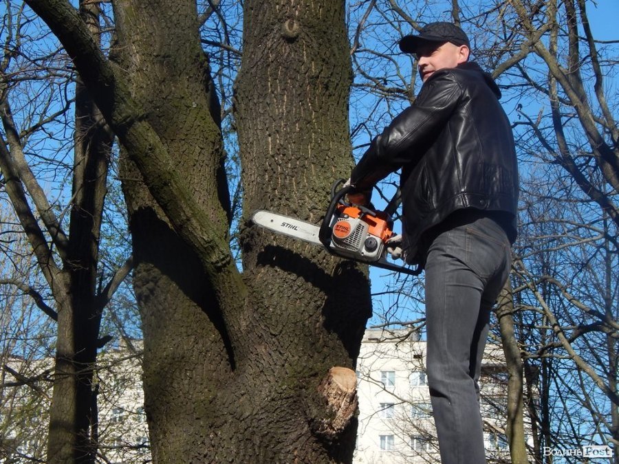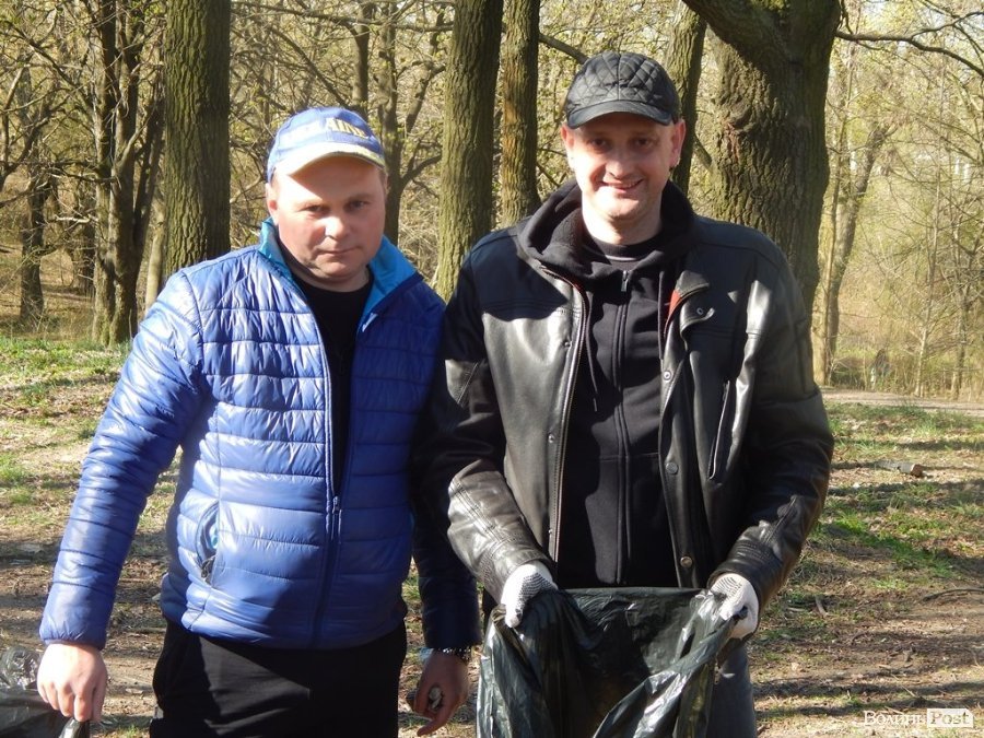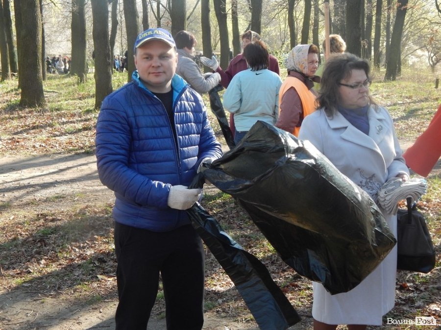 Голова Луцької міської організації партії Блок Петра Порошенка «Солідарність», а також депутат міськради Євген Ткачук прийшов на прибирання паркової території разом зі своїм сином Володимиром. Він мовив, що прибирання «Дубового гаю» планувалося провести ще до великодніх свят, але погодні умови не дали цього зробити.