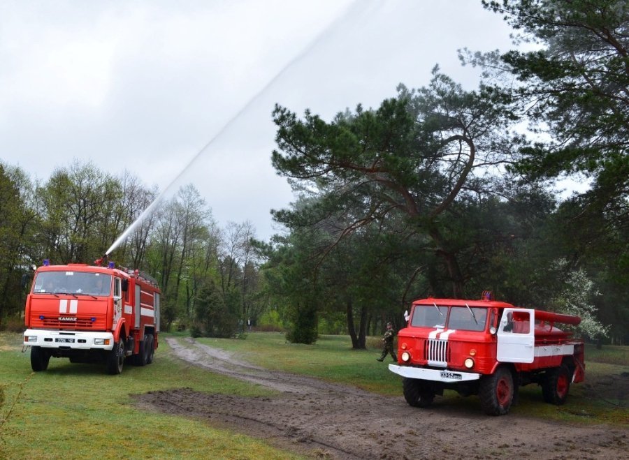 Наступний етап занять – практичне відпрацювання основних прийомів гасіння вогню у лісах – відбулися у лісовому масиві поблизу села Зелена Ковельського району. Розпочався цей етап з демонстрації основних зразків пожежно-рятувальних автомобілів, які застосовують для ліквідації лісових пожеж: автоцистерну та пожежну насосну станцію.