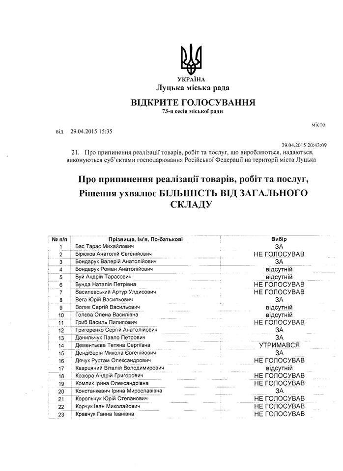 «Вчора відбулась 73 - я сесія Луцької міської ради на якій депутати не підтримали проект рішення «Про припинення реалізації товарів, робіт та послуг, що виробляються, надаються, виконуються суб'єктами господарювання Російської Федерації на території міста Луцька», як і обіцяли , надаємо результати поіменного голосування.