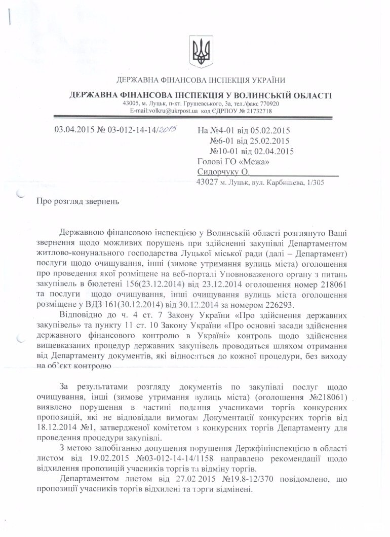 Раніше Держфінінспекція у Волинській області вже відміняла незаконну закупівлю Департаментом житлово-комунального господарства Луцької міської ради послуг щодо прибирання снігу в Луцьку на 2015 рік, в якій також брало участь ТзОВ «Теркоміналсервіс».