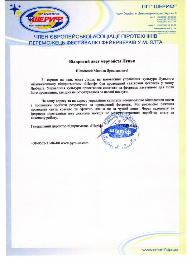 Як пише газета Хроніки Любарта від 22 грудня, на офіційному сайті дніпропетровського приватного підприємства «Шериф» опублікований лист до луцького міського голови Миколи Романюка.