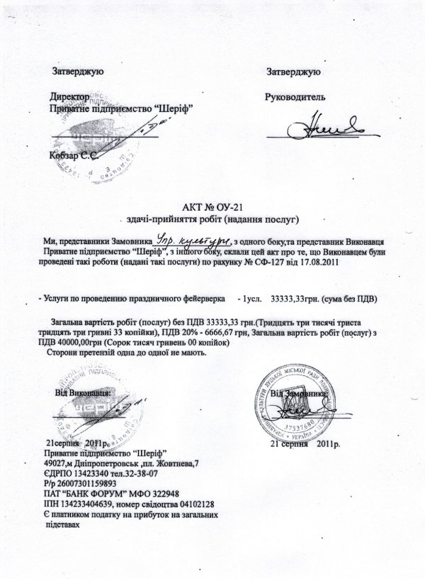 У ньому, зокрема, йдеться, що "управління культури присягалося заплатити за феєрверк уже наступного дня, але й досі не розрахувалося за надані послуги".