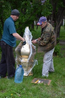 А виготовили купол та хрест майстри з Волині. Потім, за допомогою волонтерів, святиню було доставлено до райцентру Луганської області. До слова, серед бійців 24 ошб «Айдар», які передавали святиню, була і уродженка Волинської області: санінструктор одного з підрозділів батальйону Наталія із радіопозивним «Шалена».