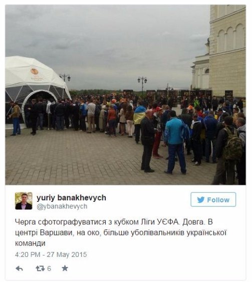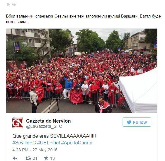 Українські вболівальники викупили всі квитки, надані УЄФА для нашої країни. А це 9,2 тисячі квитків. Сьогодні на вулицях столиці Польщі наші фанати співають гімн та "Червону руту", фотографуються із підопічними Мирона Маркевича і вболівальниками "Севільї" та активно викладають свої фото у соцмережах.