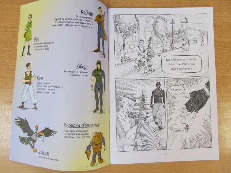 Серед героїв коміксу: Кобзар, студентка Віра, Кіборг, травник із Карпат Кріп, Виродки (колоради), двоголові орли-людожери - Дворли.