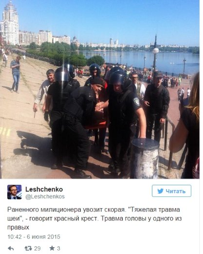Під час сьогоднішніх масових провокацій на Оболонській набережній у Києві, де відбувся "Марш рівності", отримали травми п'ять правоохоронців. Одному з міліціонерів сильно поранили шию – його терміново забрала "швидка допомога". Він у тяжкому стані.