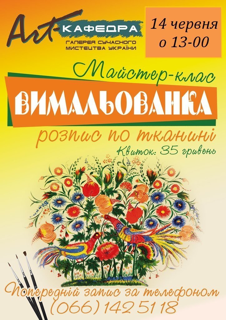 14 червня 2015 року о 13:00 у галереї сучасного мистецтва України «Art-Кафедра» відбудеться майстер-клас з художнього розпису.