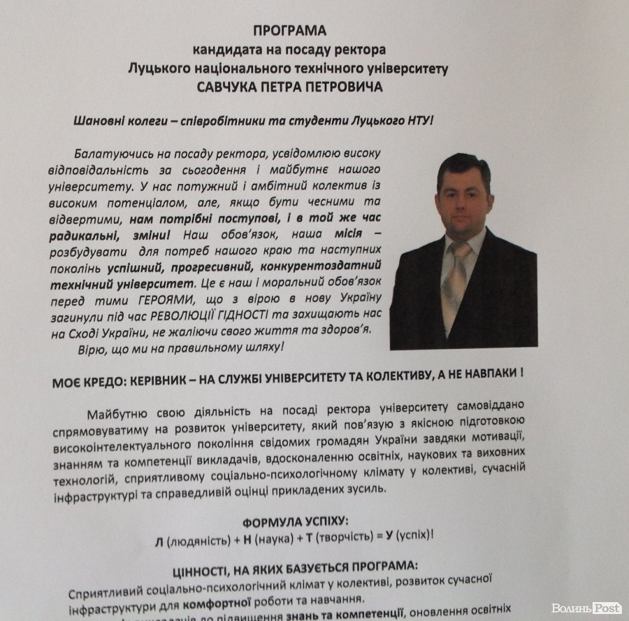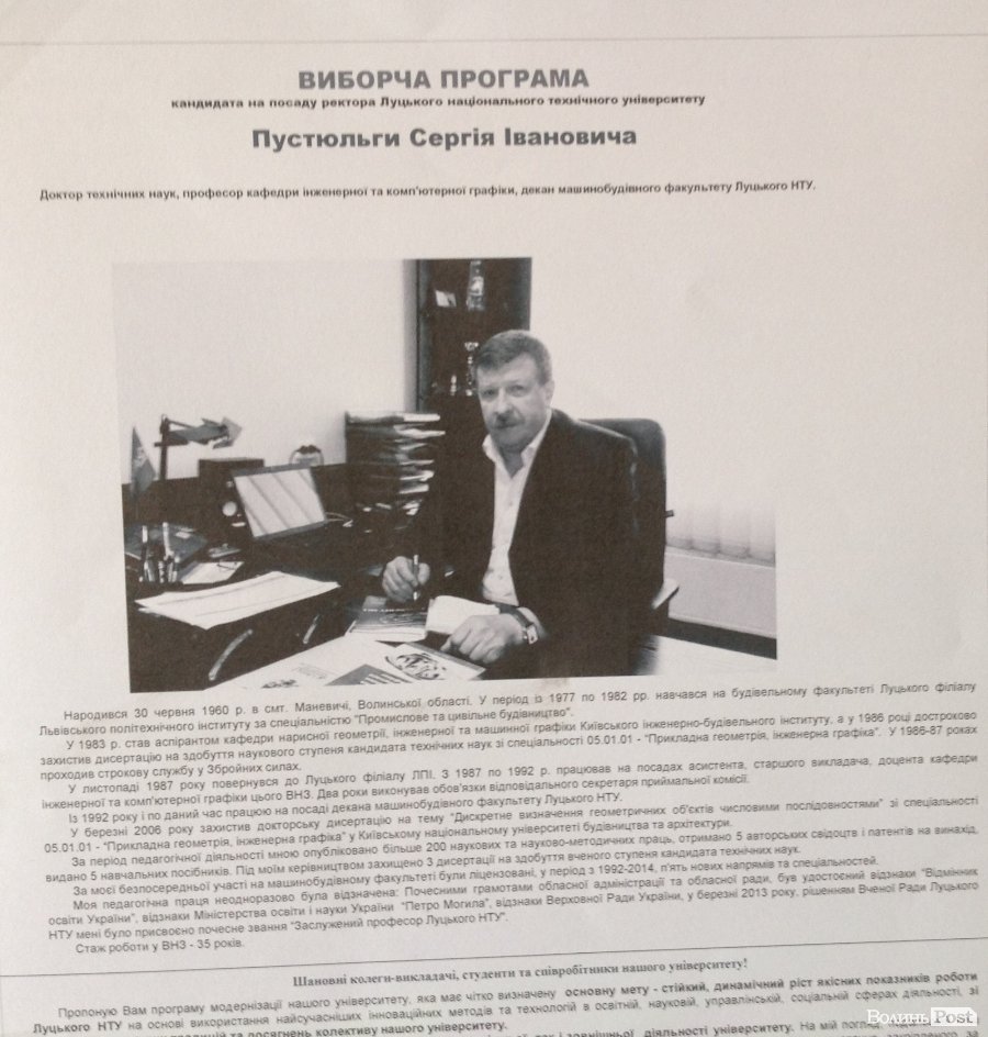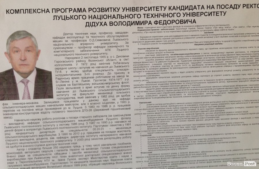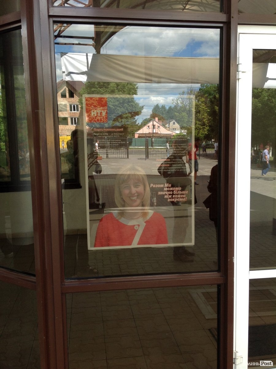 Також зазначимо, що перед входом до головної виборчої дільниці, на стенді було розміщено інформацію лише про сімох кандидатів у ректора вишу. Біографії та передвиборчої програми доньки екс-ректора ЛНТУ Зоряни Герасимчук журналіст ВолиньPost не помітив. Але в очі журналісту кинувся агітаційний банер та плакат, які були вивішені при вході до головного корпусу ЛНТУ. Зазначимо, що там вивісили лише агітаційні матеріали Зоряни Герасимчук.