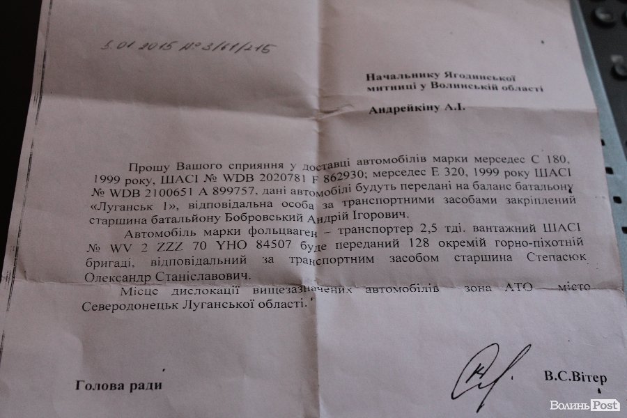 «Прошу вашого сприяння у доставці автомобілів марки «Мерседес С 180» 1999 року випуску, "Мерседес Є 320" 1999 року. Дані автомобілі будуть передані на баланс батальйону «Луганськ 1», відповідальна особа, яка закріплена за транспортними засобами, старшина батальйону Бобровський Андрій Ігорович. І автомобіль марки Фольксфаген Транспортер вантажний – буде переданий окремій горно-піхотній бригаді, відповідальний за транспортним засобом старшина», - йдеться у листі.